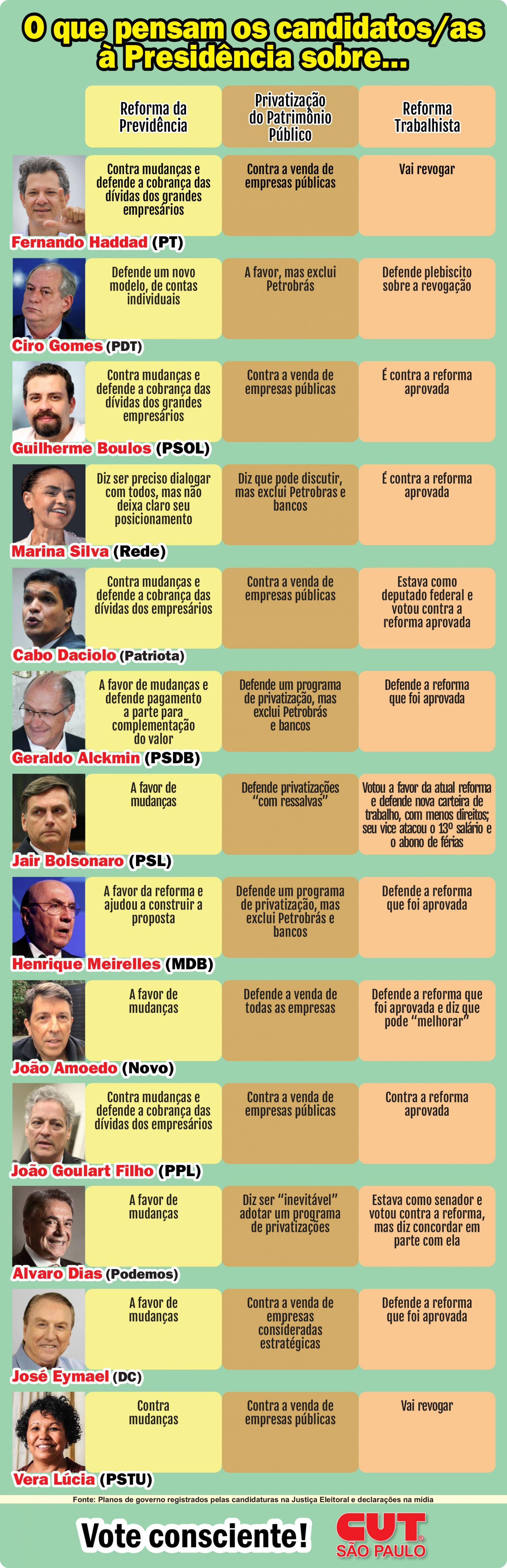 A CUT-SP fez um levantamento para saber o que planejam cada um dos 13 candidatos e candidatas à Presidência da República sobre a reforma da Previdência, privatizações de empresas públicas e a reforma trabalhista.