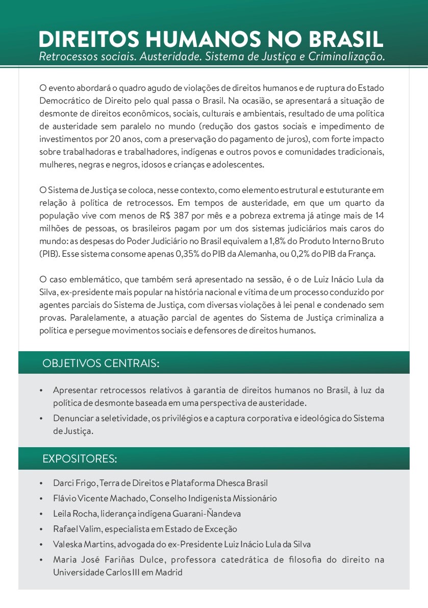 Durante o evento – proposto pela Terra de Direitos, Plataforma Dhesca Brasil e Conselho Indigenista Missionário com apoio da Justiça Global e da Fian Brasil – será apresentado o quadro agudo de violações de direitos humanos à luz da política de desmonte baseada em uma perspectiva de austeridade e de ruptura do Estado Democrático de Direito pelo qual passa o Brasil.