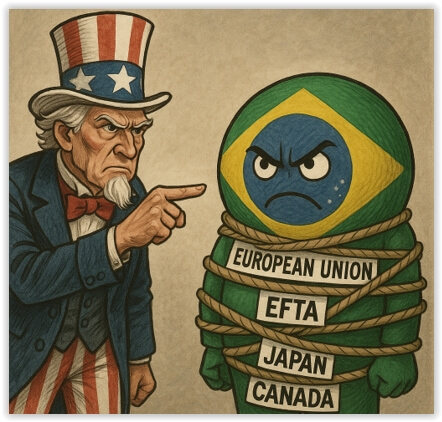 O principal instrumento para dobrar o País foi a imposição de tarifa de importação de 50%, aplicada a bens exportados para os EUA. Em resposta, o governo brasileiro apelou à diplomacia e recorreu à OMC. Ao mesmo tempo, desenhou formas de amortecer o impacto sobre produtores brasileiros e acena cautelosamente com a imposição de medidas de retaliação, invocando a Lei de Reciprocidade Econômica, que autoriza o país a responder a medidas unilaterais impostas por parceiros comerciais.