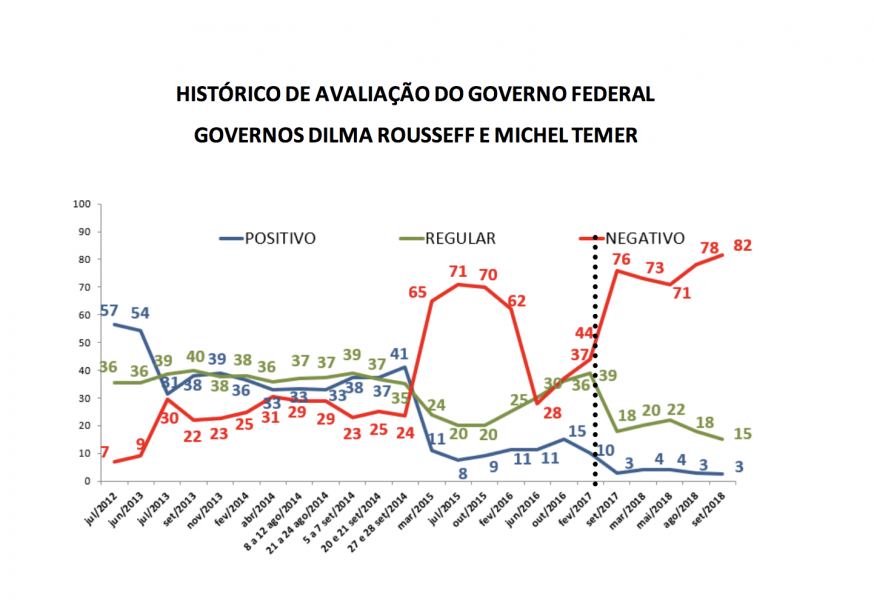 Chama a atenção a curva de popularidade negativa do governo Temer (ver gráfico no topo), já bem superior ao do segundo mandato de Dilma Rousseff, o que em si ajuda a explicar o avanço de Bolsonaro e Haddad.