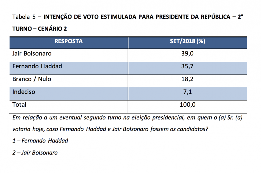 CENÁRIO 2: Jair Bolsonaro, 39,0%; Fernando Haddad, 35,7%; Branco/Nulo, 18,2%; Indecisos, 7,1%.