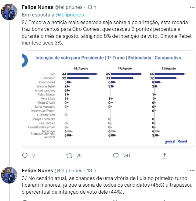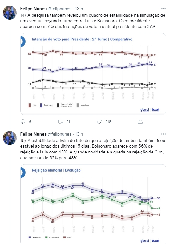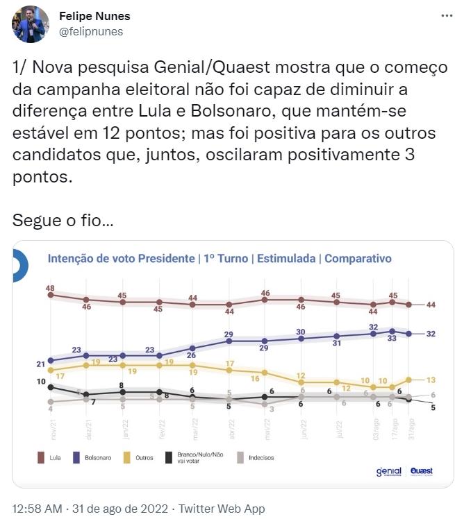 Segundo Felipe Nunes ((@felipnunes), diretor da Quaest Pesquisa, a nova rodada mostra que o horário político não foi capaz de diminuir a diferença entre Lula e Bolsonaro, que mantém-se estável em diferença de 12 pontos.