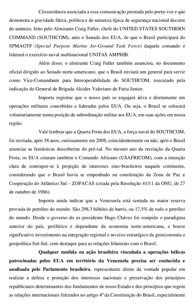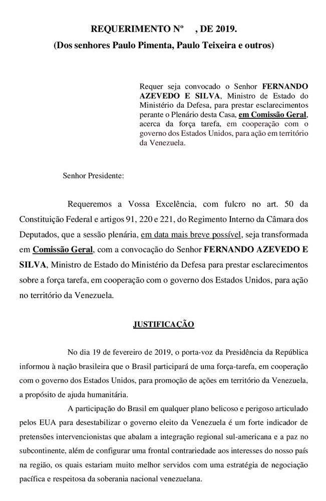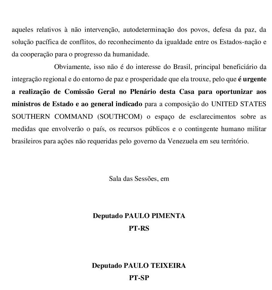 No requerimento, Pimenta e Teixeira assinalam que a Constituição brasileira é clara no tocante à autodeterminação dos povos, não ingerência, defesa da paz e da solução pacífica de conflitos e não é do interesse do Brasil, “principal beneficiário da integração regional sul-americana, e do entorno de paz e prosperidade por ela criada”, participar da ação em território venezuelano patrocinada pelos EUA.