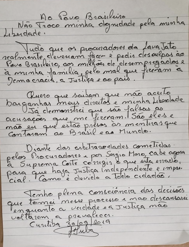 Lula já provou que é inocente de todas as acusações que lhe fizeram. Já demonstrou que não negocia seu direito nem sua dignidade.