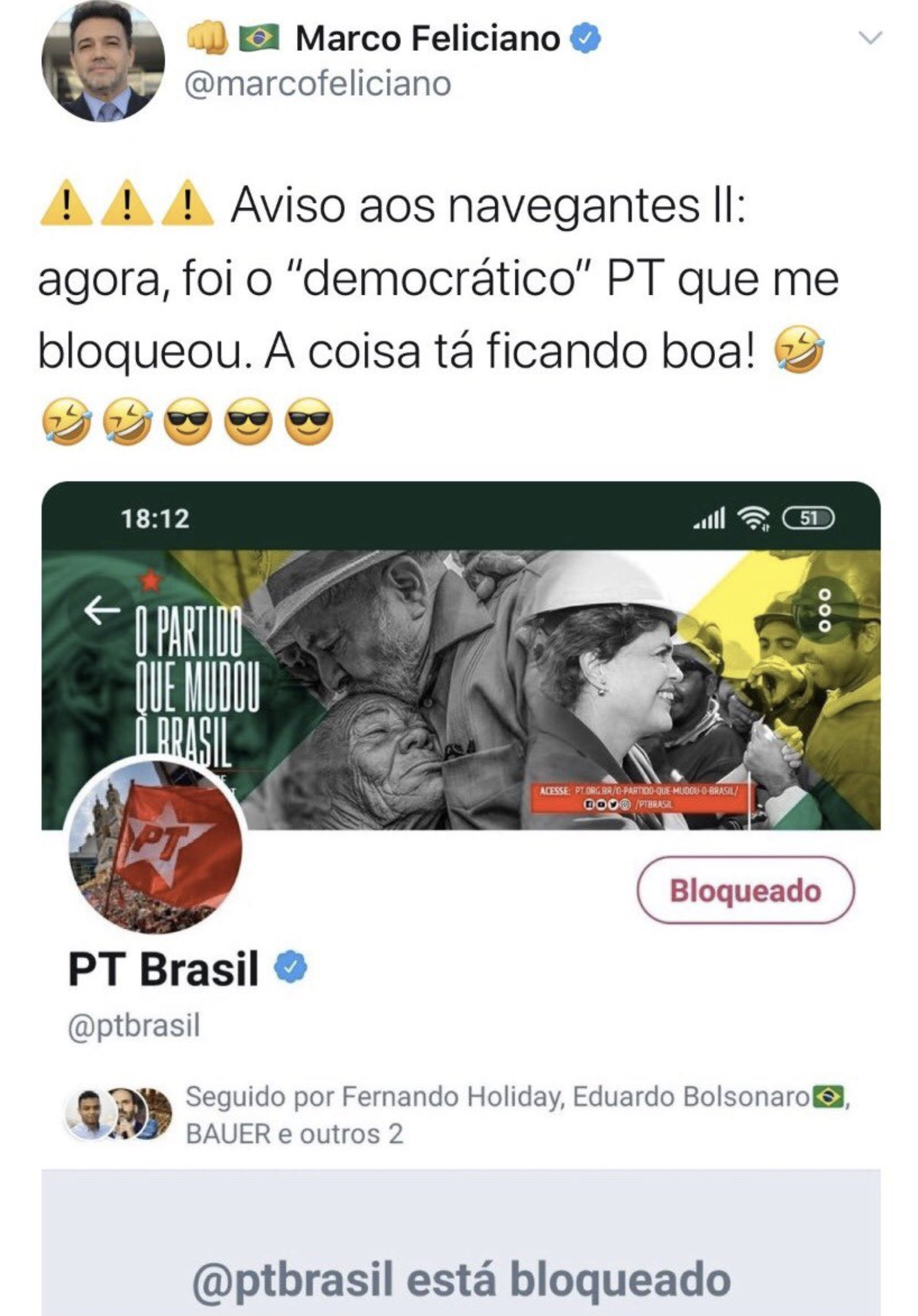“Foi o democrático PT que me bloqueou”, ele choramingou a seus seguidores.