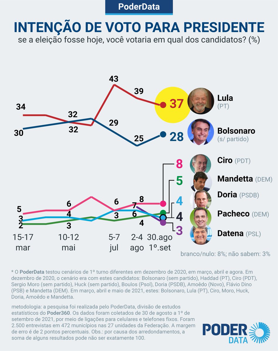 Ciro Gomes, 9%; Moro, 9%; e Doria, 8%.