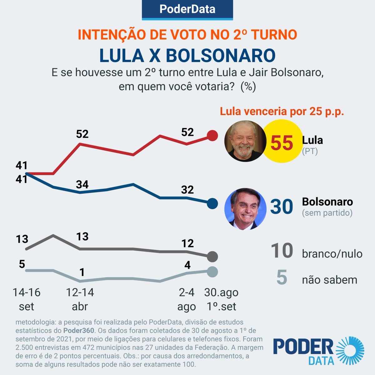No segundo turno, o petista ampliou sua vantagem sobre Bolsonaro para 25%: 55% a 30%.