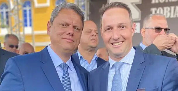 O secretário de Segurança Pública de SP, Guilherme Derrite, ao lado do governador Tarcísio de Freitas