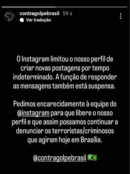 O canal criado no Instagram para receber denúncias de pessoas que participaram dos atos de vandalismo, o Contragolpe, teve seu perfil bloqueado para novas postagens depois de uma ação em massa orientadas nos grupos bolsonaristas para denunciar o perfil no Instagram.