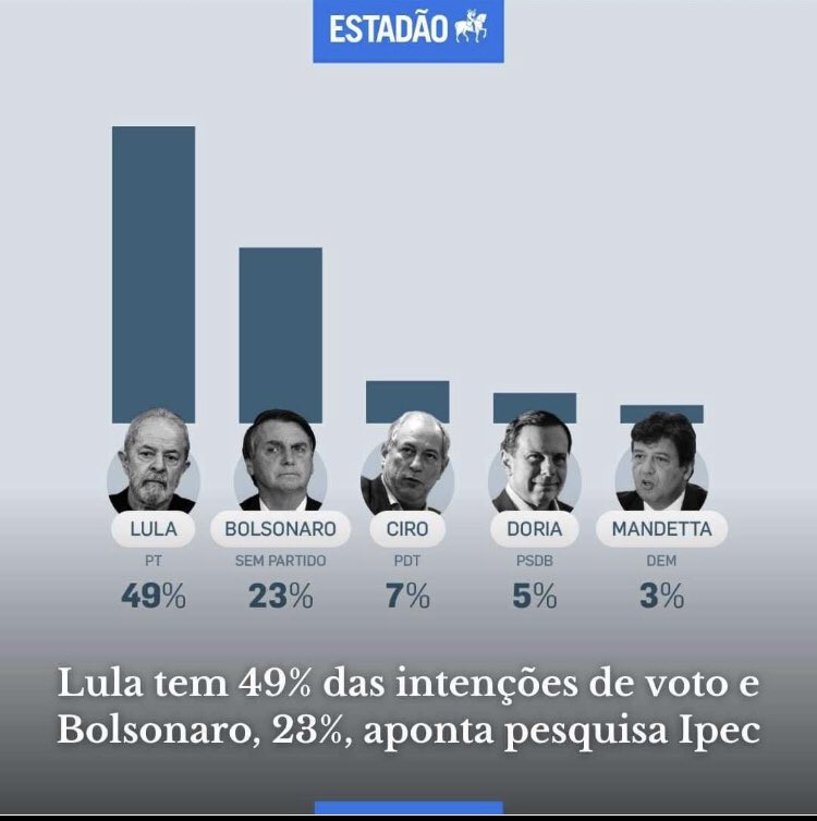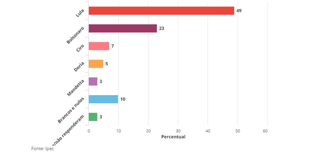 A mesma pesquisa mostra Lula com 49% contra 23% de Bolsonaro no primeiro turno. Ciro tem 7%.