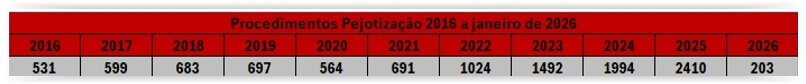 Os números evidenciam aumento importante de procedimentos instaurados. Em 2021, foram 691. Em 2025, saltaram para 2.410. Só em janeiro de 2026, já somam 203.
