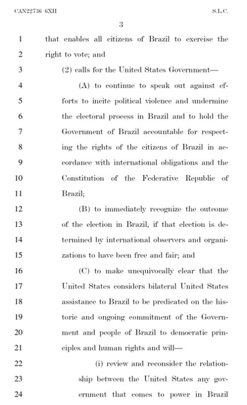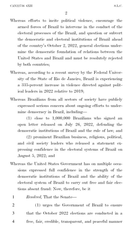 Considerando que os esforços para incitar a violência política, encorajar as forças armadas do Brasil a intervir na condução dos processos eleitorais do Brasil e questionar ou subverter as instituições democráticas e eleitorais do Brasil frente às eleições gerais do país em 2 de outubro de 2022, minam o fundamento democrático das relações entre os Estados Unidos e o Brasil e devem ser resolutamente rejeitados por ambos os países;