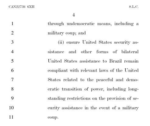 (ii) garantir que a assistência de segurança dos Estados Unidos e outras formas de cooperação bilateral dos Estados Unidos ao Brasil permaneçam em conformidade com as leis relevantes dos Estados Unidos relacionadas com a transição pacífica e democrática de poder, incluindo restrições de longo prazo à prestação de assistência de segurança em caso de golpe militar.