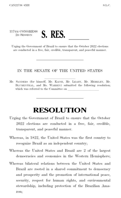 Na noite dessa quarta-feira, 28-09, o Senado americano aprovou por unanimidade uma resolução (na íntegra, ao final) na qual “exorta o governo do Brasil a assegurar que as eleições de outubro de 2022 sejam conduzidas de maneira livre, justa, crível, transparente e pacífica”.
