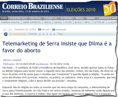 Política Serra continua acusando Dilma de propor aborto 15/10/2010 - 20:14 Tempo de leitura: < 1 min do Tijolaço, o blog do Brizola Neto Apoie o VIOMUNDO R$ 5 R$ 15 R$ 35 Qualquer valor Siga-nos no