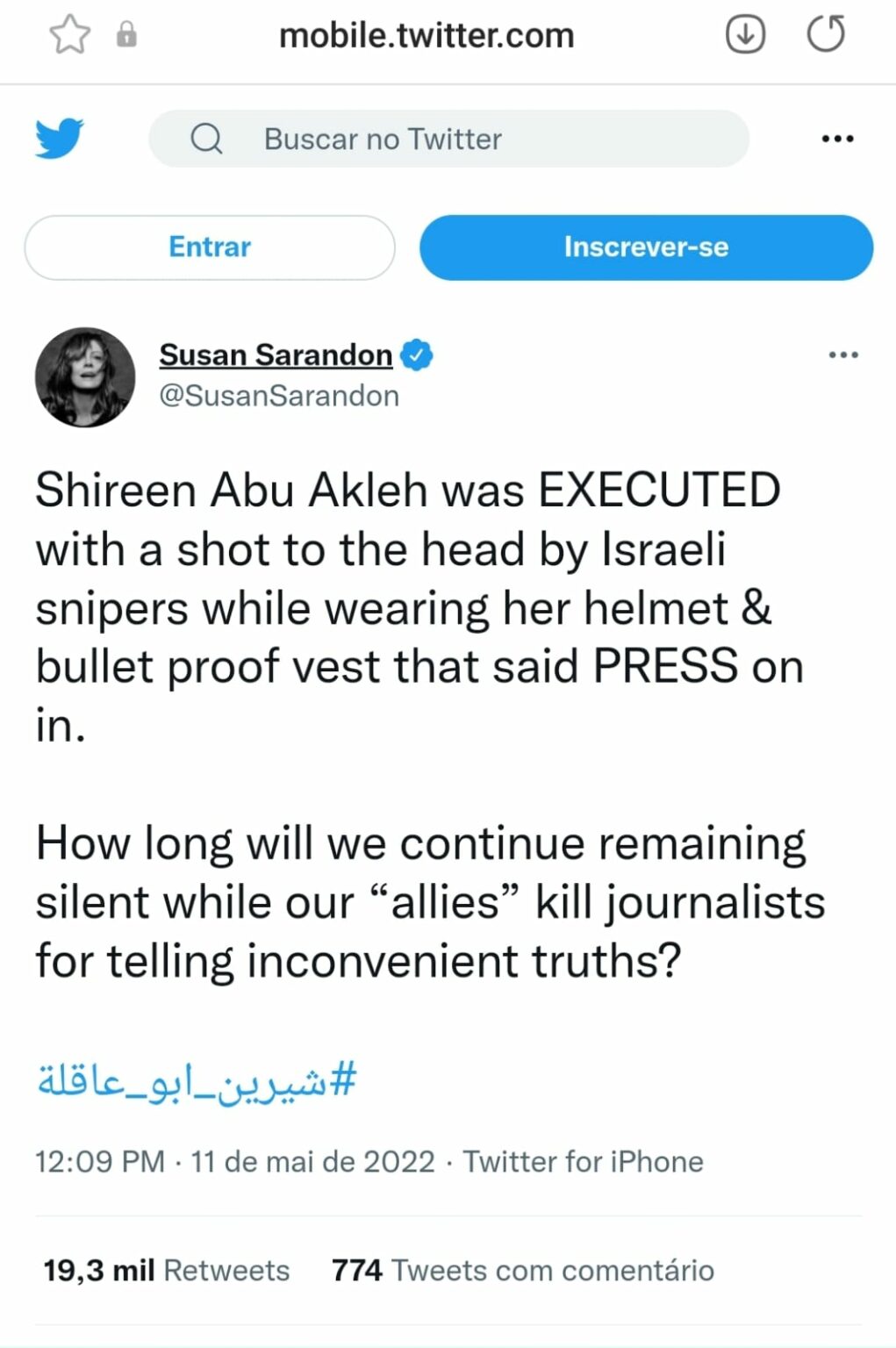 Susan Sarandon: “Até quando ficaremos em silêncio enquanto nossos ‘aliados’ matam jornalistas por dizerem verdades inconvenientes?”
