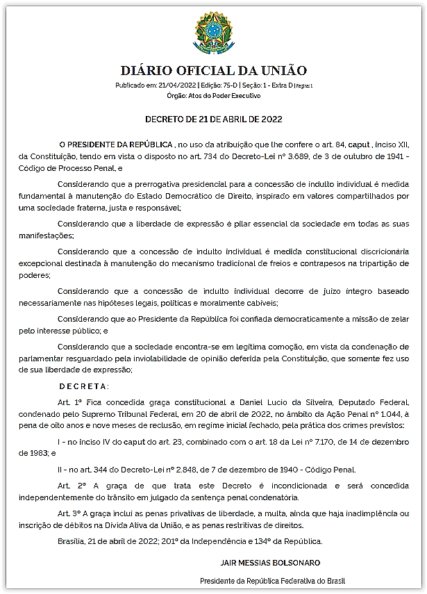 Nessa quinta-feira, 21-04, o presidente Jair Bolsonaro concedeu graça ou indulto ao deputado federal Daniel Silveira, condenado no dia anterior pelo Supremo Tribunal Federal (STF).