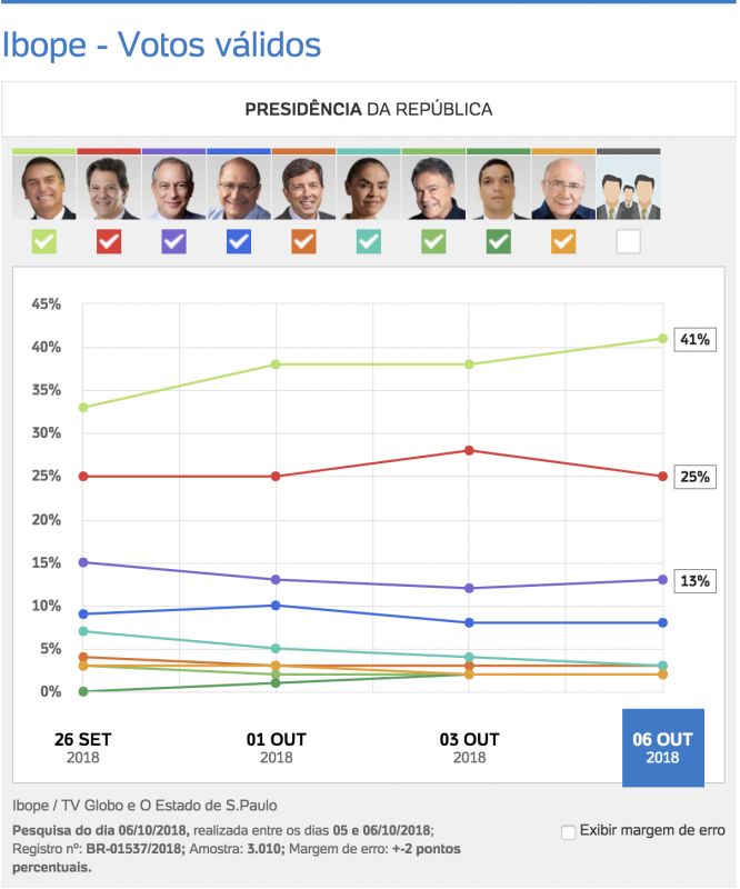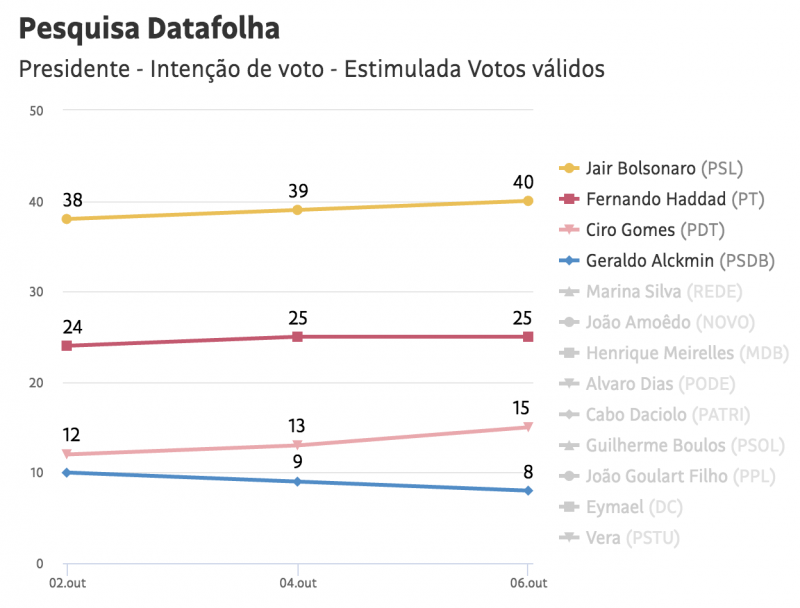 Mas a curva da pesquisa Ibope mostra que Fernando Haddad, do PT, tinha 25% em primeiro de outubro, dia da divulgação da delação, experimentou leve alta mas voltou a cair em seguida, ao mesmo tempo em que Bolsonaro, que estava estacionado, cresceu para 41%.