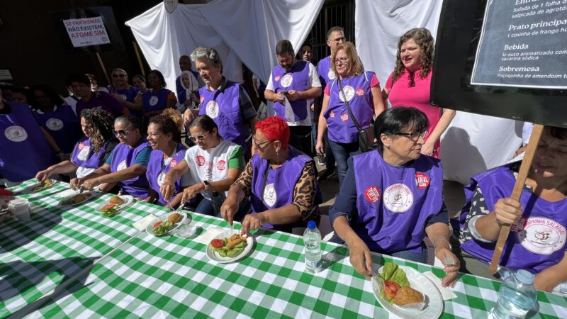 Durante o ato, foi servido um almoço com “cardápio variado”, composto por uma salada com uma folha de alface e uma rodela de tomate, de prato principal aquela que infelizmente há décadas se repete nesse menu: a coxinha, acompanhada de suco em pó (muito conhecido pelo nome da marca “Ki-Suco”); e de sobremesa uma paçoquinha, simbolizando o que é possível comer com o valor do VR.