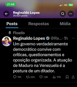 O deputado federal Reginaldo Lopes foi ao X [veja abaixo] lacrar sobre a Venezuela.