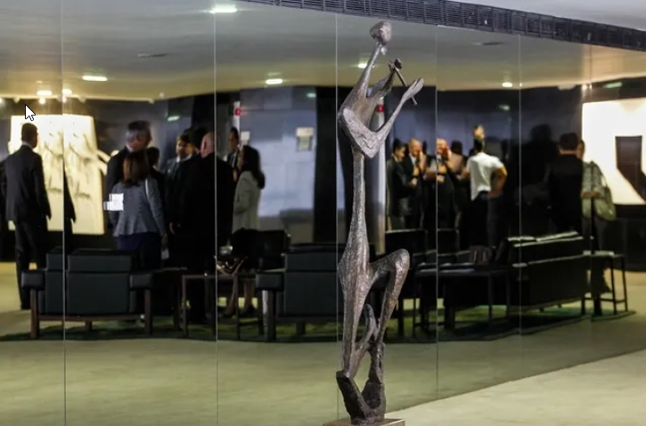 Escultura “O Flautista”, de Bruno Jorge, antes de ser danificada por vândalos bolsonaristas. Feita em bronze, ela foi completamente destruída, com pedaços espalhados pelo salão. Está avaliada em R$ 250 mil.