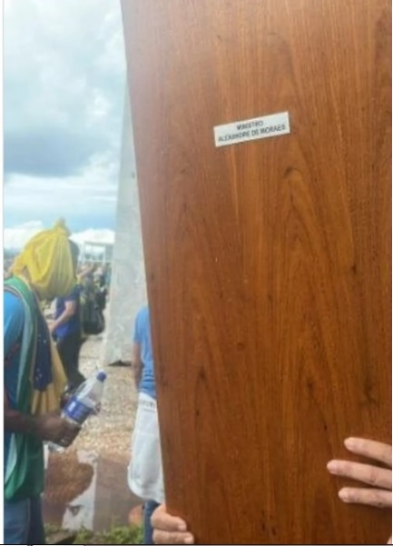 Homem carrega a porta do gabinete do ministro do STF Alexandre de Moraes — Foto: Reprodução/Redes sociais