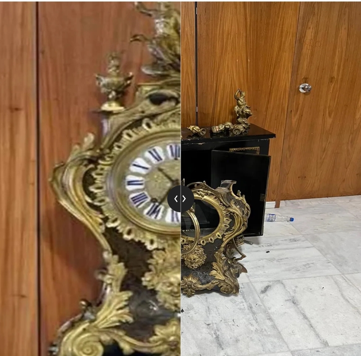 Relógio de Balthazar Martinot. Também destruído pelos vândalos bolsonaristas. O relógio de pêndulo do Século XVII foi um presente da Corte Francesa para Dom João VI. Martinot era o relojoeiro de Luís XIV. Existem apenas dois relógios deste autor. O outro está exposto no Palácio de Versailles, mas possui a metade do tamanho da peça que foi completamente destruída pelos invasores do Planalto. O valor da peça não foi informado. Segundo o governo, a recuperação do objeto é ‘muito difícil’.