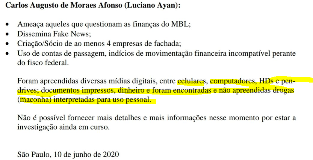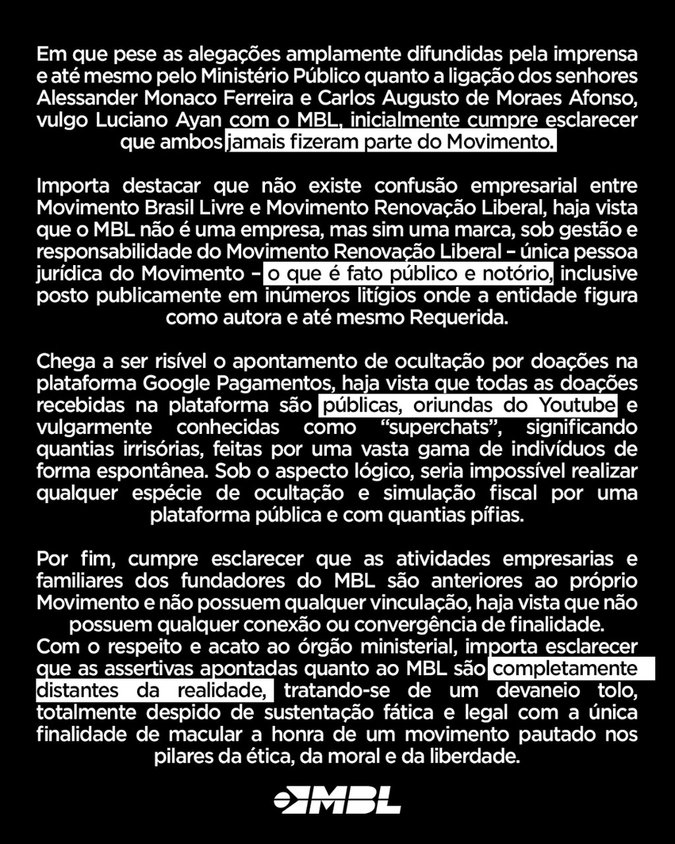 o MBL afirma que Ayan e Mônaco “jamais fizeram