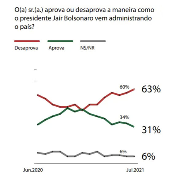 Pesquisa XP-Ipespe divulgada hoje mostra que a desaprovação pessoal a Jair Bolsonaro atingiu 63%, 3 pontos a mais que no levantamento anterior.