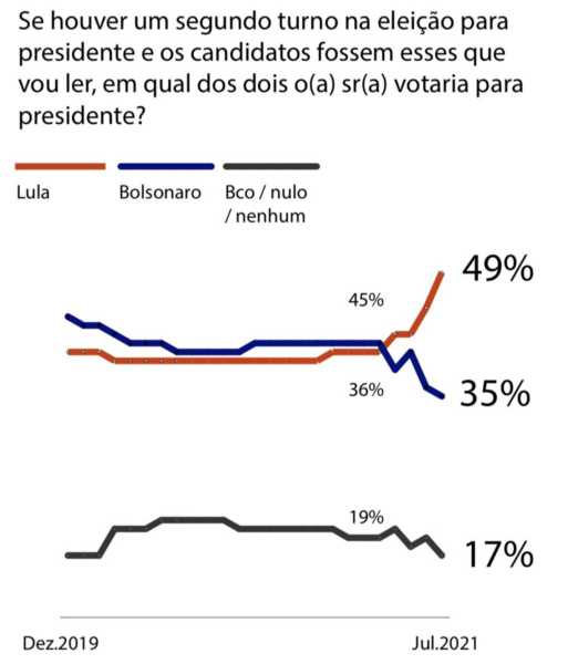 No segundo turno, Lula bateria Bolsonaro por 49% a 35%, aumento de 4 pontos para o ex-presidente e queda de um para Bolsonaro.