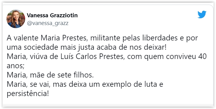 É com muita tristeza que comunicamos a passagem de nossa querida dona Maria Prestes, esposa do Cavaleiro da Esperança Luiz Carlos Prestes. Dona Maria completou 90 anos dia 02 de fevereiro, dia de Iemanjá, e hoje nos deixou, vítima do pic.twitter.com/EQ2J1zXGfM