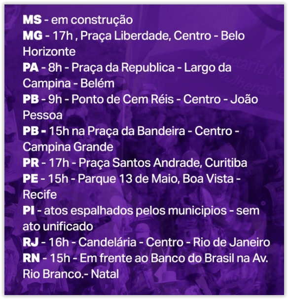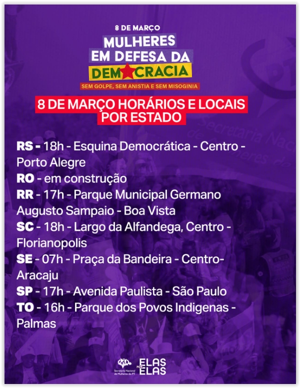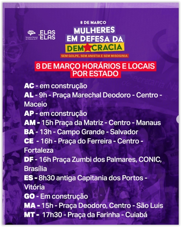 Confira os locais e os horários dos atos que irão acontecer em todo o Brasil em defesa da democracia e  homenagem ao Dia Internacional da Mulher