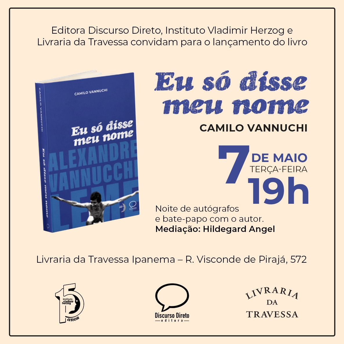 Nesta terça-feira, 7, às 19h, lançamento do livro Eu só disse meu nome, de Camilo Vannuchi, na Livraria da Travessa de Ipanema (Rua Visconde de Pirajá, 572). Haverá um breve bate-papo com o autor, mediado pela jornalista Hildegard Angel.