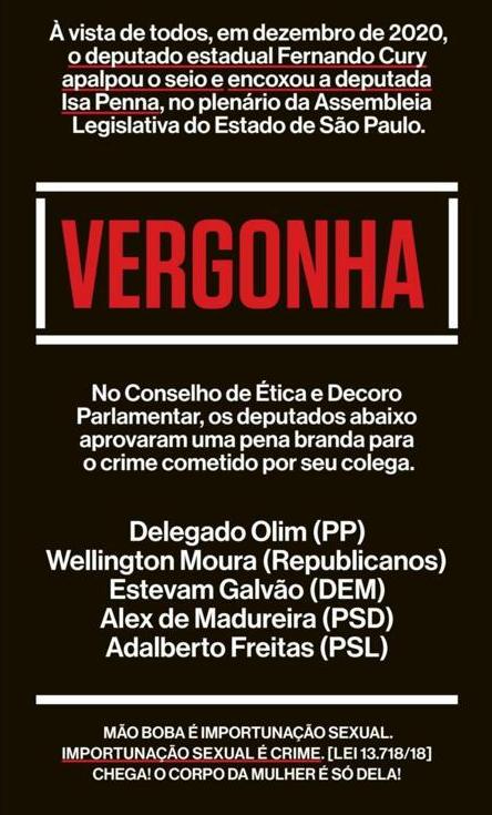 Isa Penna registrou BO e denunciou Cury ao Conselho de Ética da Assembleia por importunação sexual e quebra do decoro parlamentar.