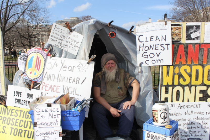 O norte-americano de 59 anos de idade resolveu se instalar em uma barraca em frente à Casa Branca com um único objetivo: falar com Trump.