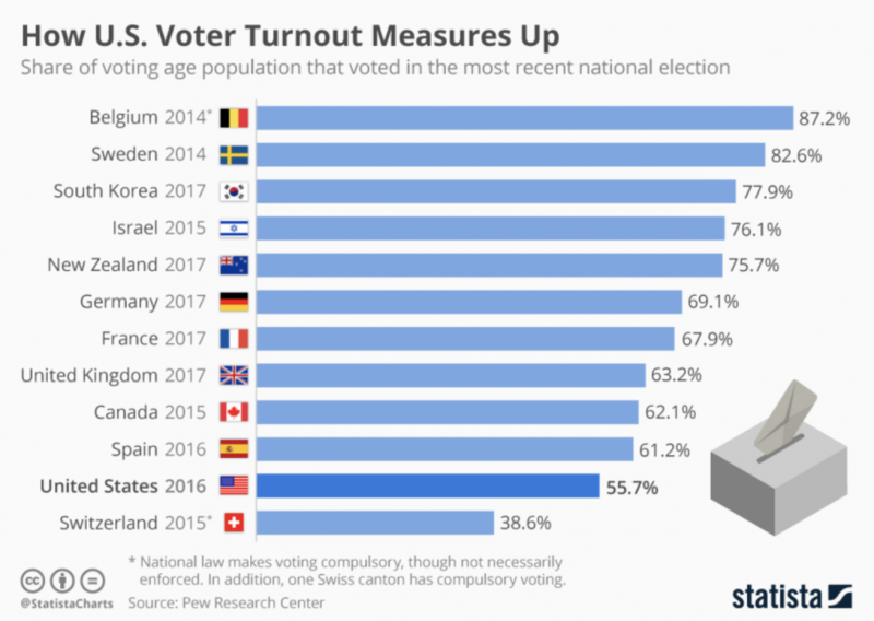 A taxa de comparecimento é mesmo muito baixa, se comparada à de outros países do mesmo nível de desenvolvimento, de acordo com a Statista: