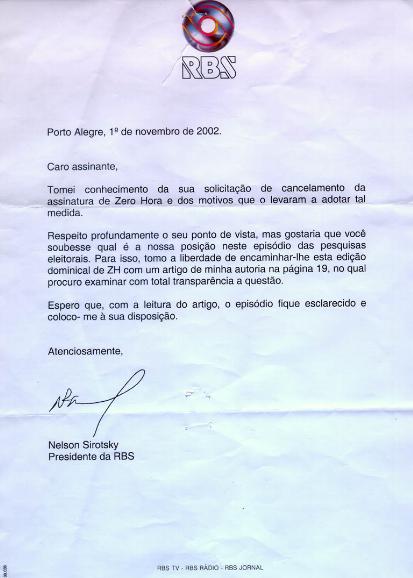 Desolados e inconformados com a ousadia da empresa, espontaneamente começou um movimento de cancelamento de assinatura do jornal Zero Hora. Para frear a significativa perda de assinantes, o presidente do grupo, Nelson Sirotsky, neste domingo (3/11/2002), por motoboy, endereçou-lhes carta com a seguinte informação: “Respeito profundamente seu ponto de vista, mas gostaria que você soubesse qual é a nossa posição neste episódio das pesquisas eleitorais. Para isso, tomo a liberdade de encaminhar-lhe esta edição dominical de ZH com um artigo de minha autoria na página 19…”.