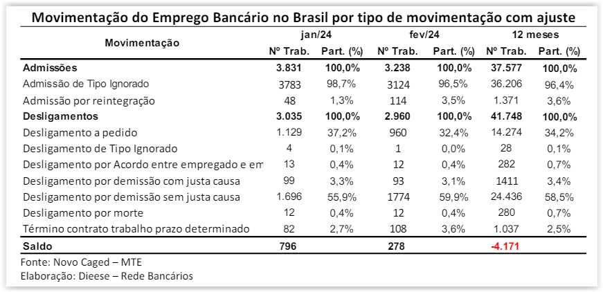 A Pesquisa do Emprego Bancário (PEB) referente ao primeiro bimestre de 2024, elaborada pelo Departamento Intersindical de Estatística e Estudos Socioeconômicos (Dieese), com base nos dados do Cadastro Geral de Empregados e Desempregados (Novo Caged), aponta uma eliminação de 4.171 postos de trabalho bancário no acumulado dos últimos 12 meses.