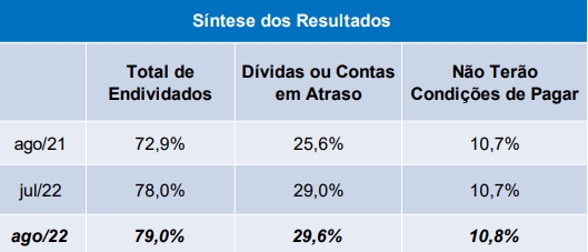 Agosto de 2022: a proporção das famílias endividadas subiu um ponto, chegando a 79%. Novo recorde.