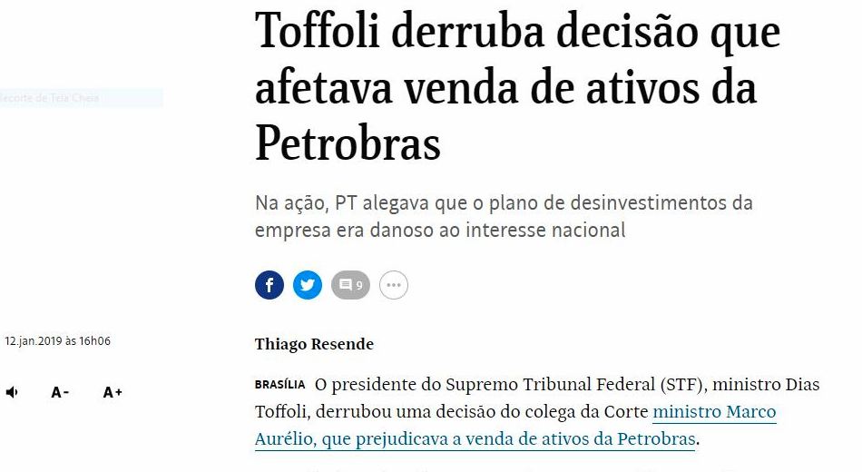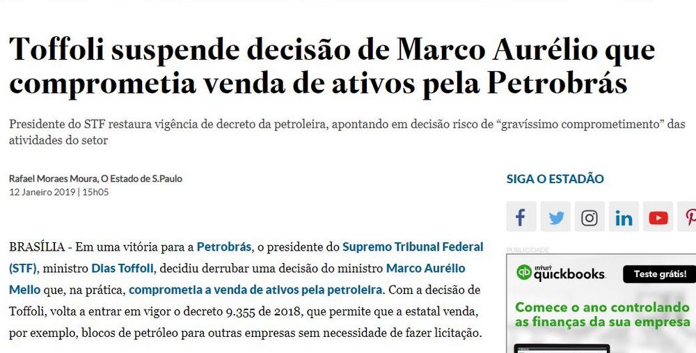No dia seguinte à posse do seu novo presidente, Roberto Castello Branco, a Petrobrás ajuizou no STF uma ação, pleiteando a cassação imediata da liminar do ministro Marco Aurélio.