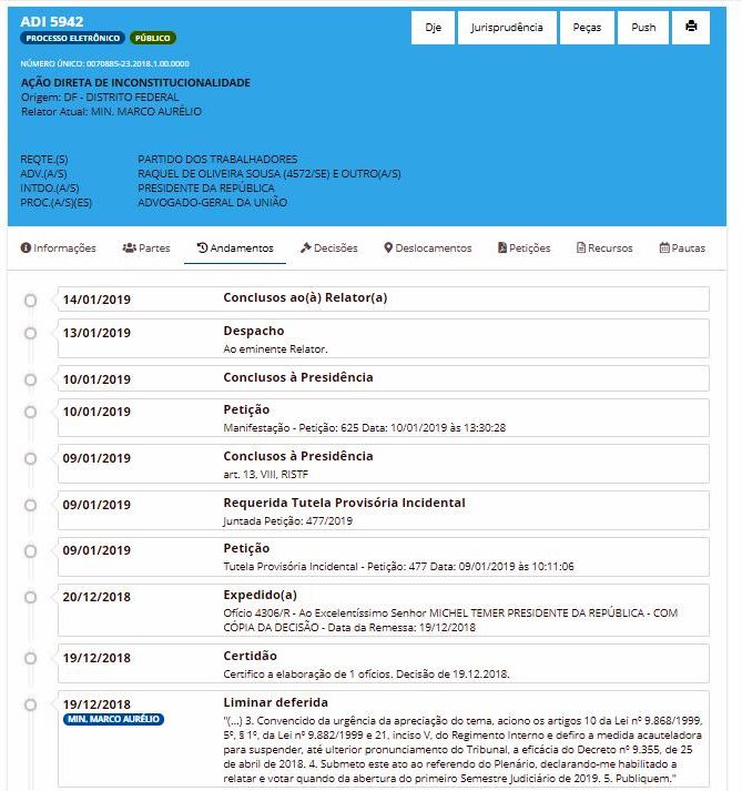 No sábado que passou, 12/01, o ministro Dias Toffoli, presidente do Supremo Tribunal Federal (STF), cassou a liminar deferida pelo ministro Marco Aurélio, que suspendia o decreto nº 9.355/2018, do ex-presidente Michel Temer (MDB).