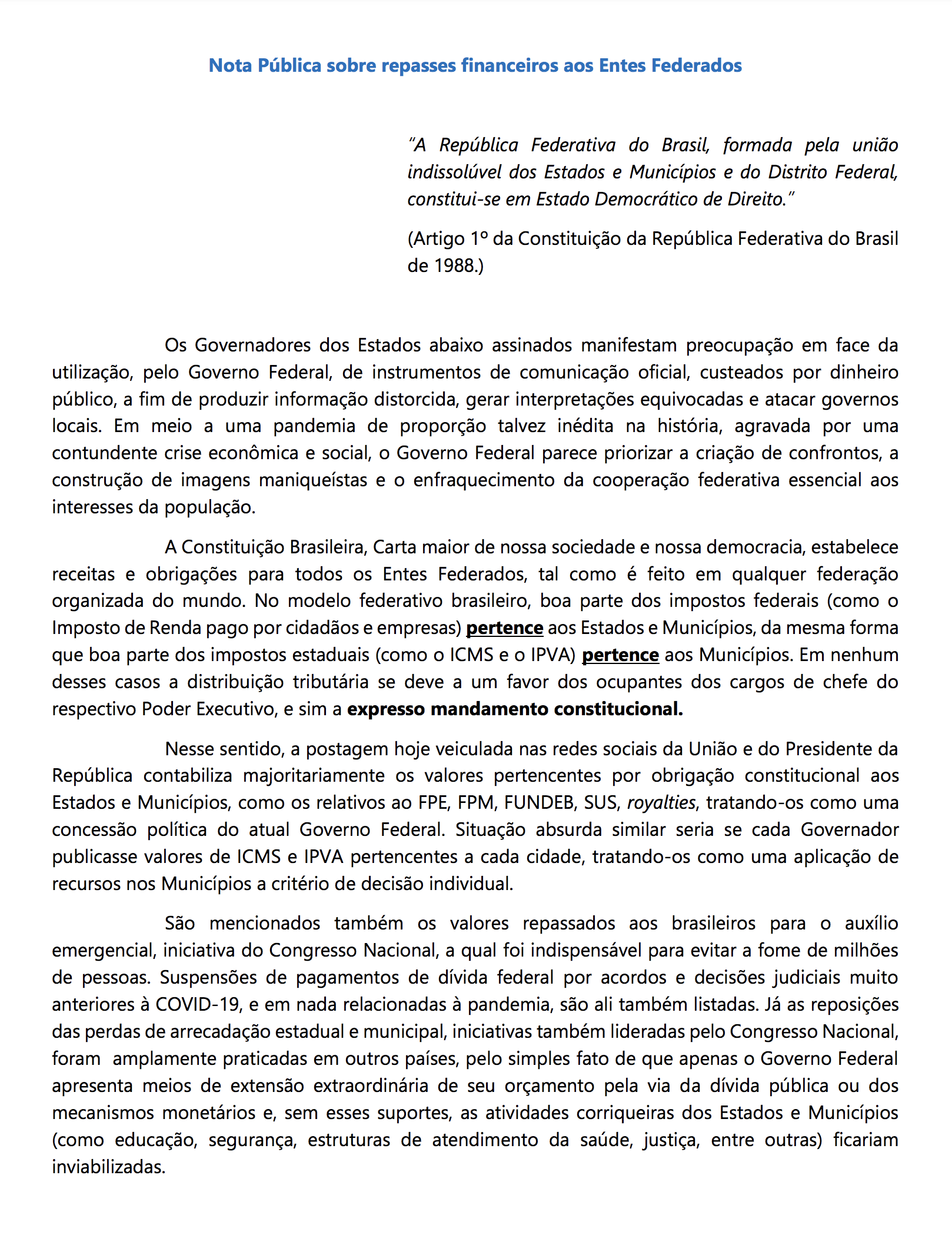 Carta dos governadores a Bolsonaro denuncia uso de dinheiro público para “produzir informação distorcida” e atacar governos locais; íntegra