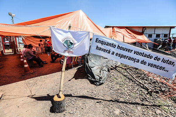 Atingidos pela barragem do Baixo Iguaçu, no Paraná, acamparam em frente a construção para lutar por seus direitos em 2016. Foto: Joka Madruga/Terra Sem Males