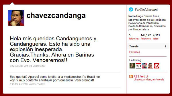 Você escreve Chávez bomba, no twitter; Chávez, bomba no twitter 01/05/2010 - 10:31 Tempo de leitura: < 1 min Apoie o VIOMUNDO R$ 5 R$ 15 R$ 35 Qualquer valor Siga-nos no