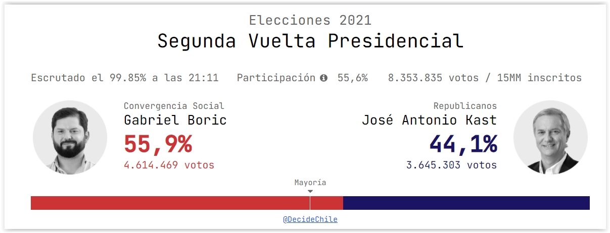 Em números absolutos, Boric obteve 4.614.469 votos e Kast, 3.645.303.