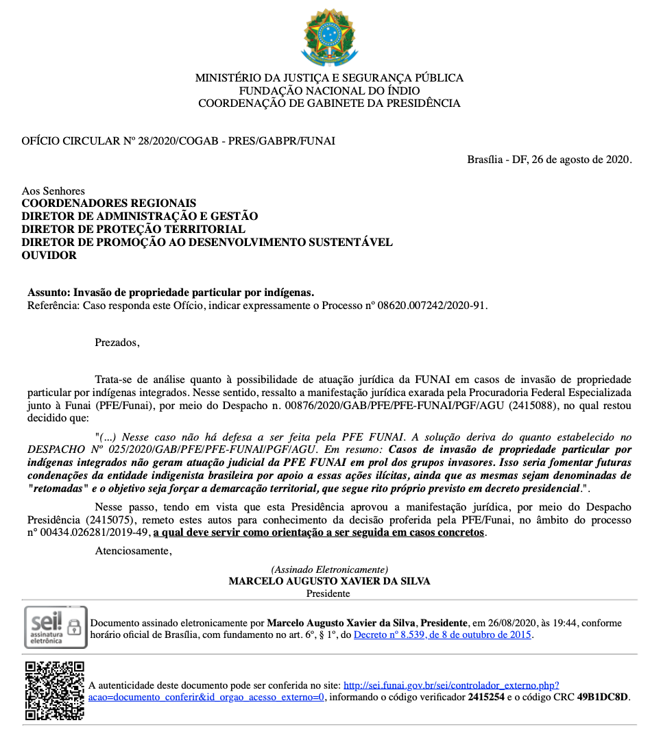 Para o delegado presidente da Funai, atuar em tais ações pode “fomentar futuras condenações da entidade indigenista brasileira por apoio a essas ações ilícitas, ainda que as mesmas sejam denominadas de retomadas”.