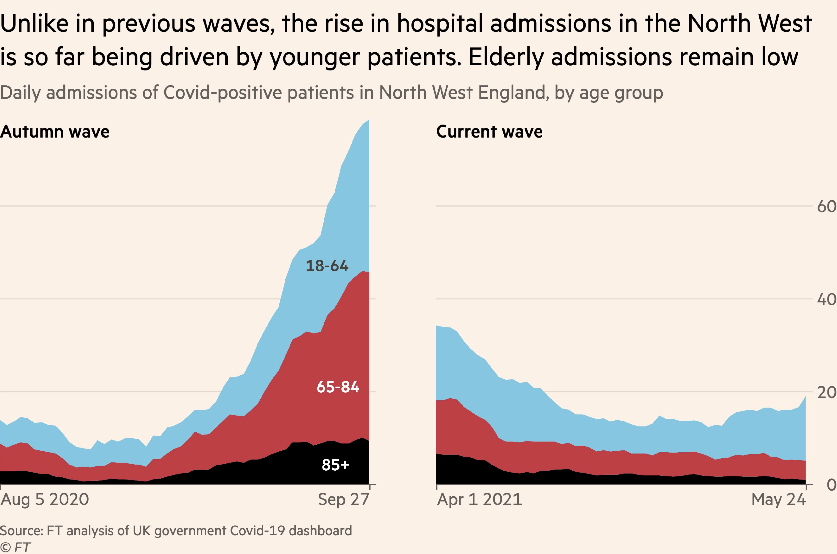 • Mas as vacinas estão mantendo os casos e internações hospitalares em grande parte entre os grupos de idade mais jovens, cujo risco de morte por Covid é muito menor.