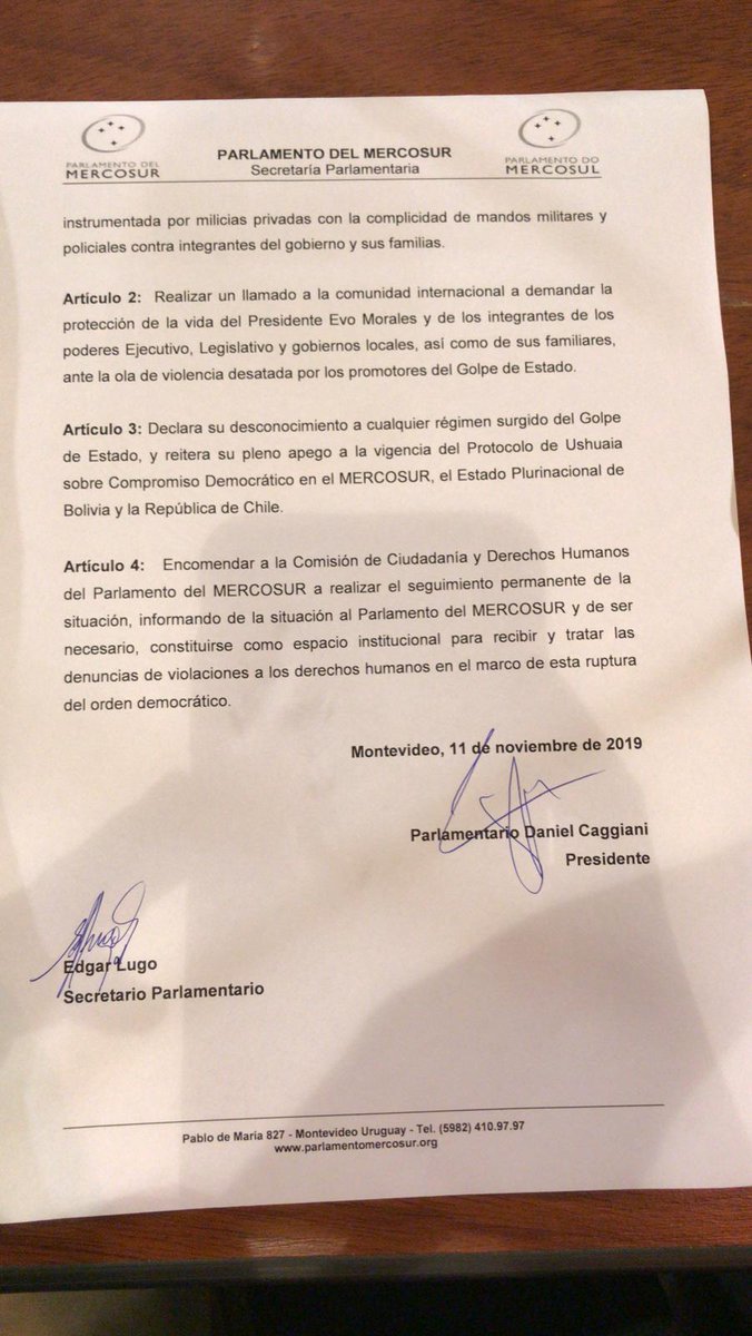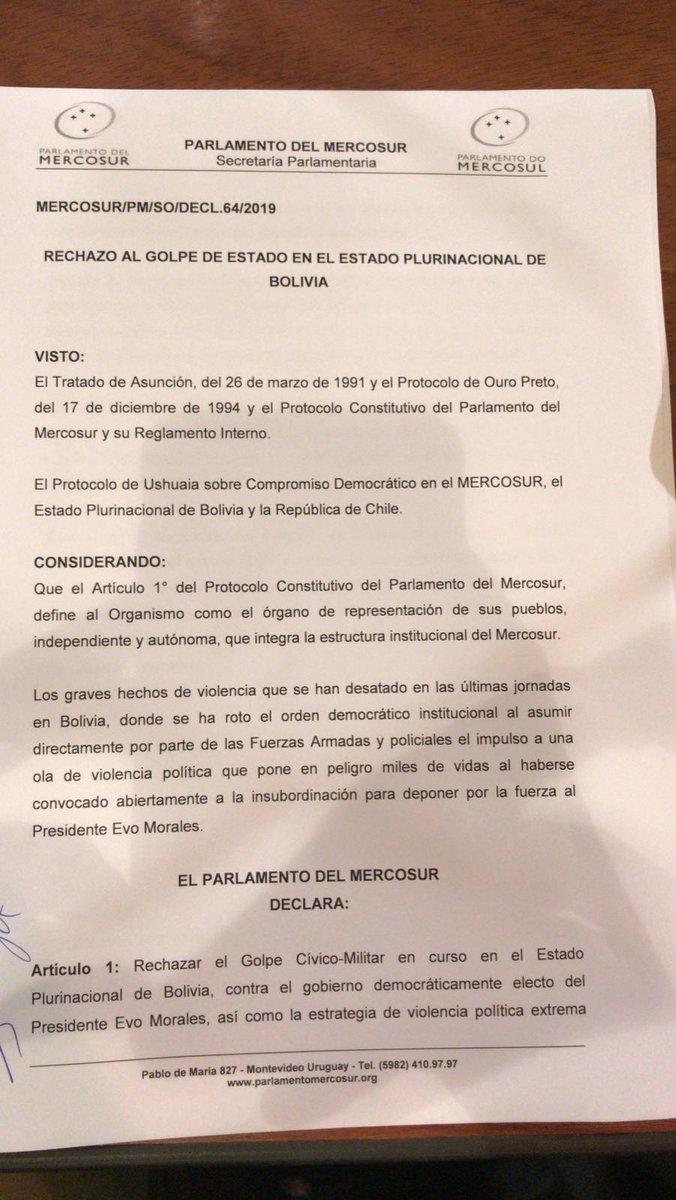 Parlamento do MERCOSUL (Parla-Sul) aprova Moção de Repúdio ao Golpe de Estado na Bolívia.