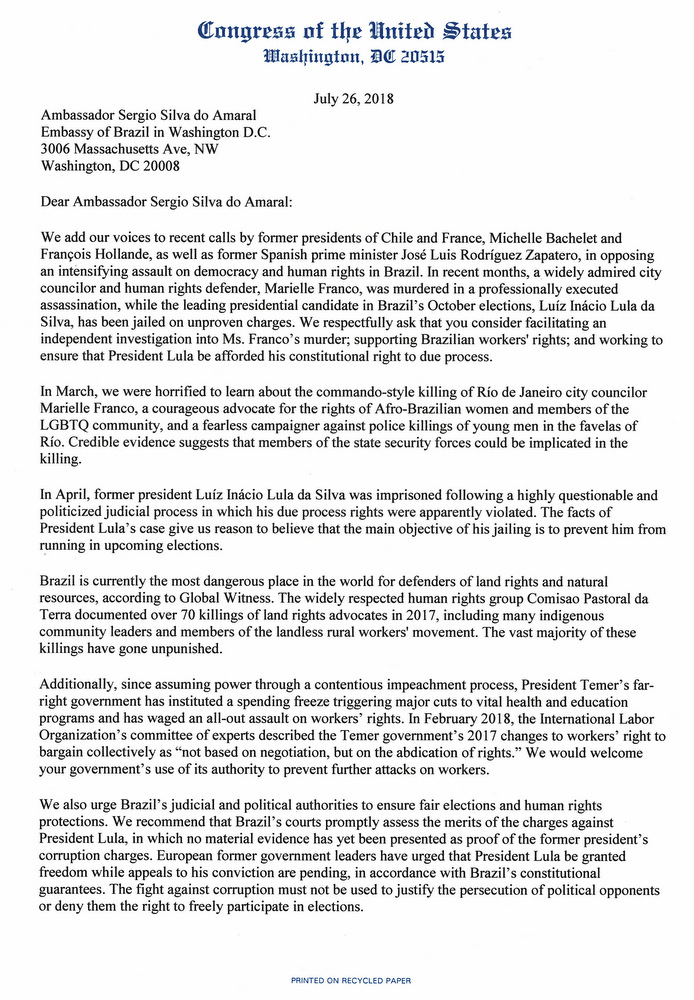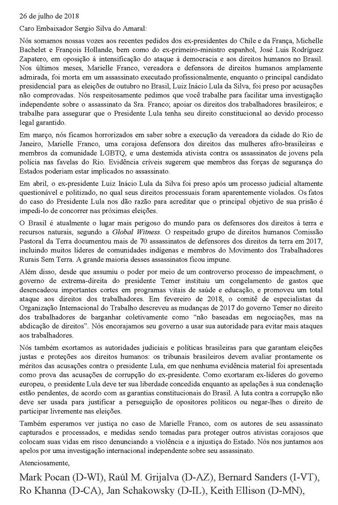Um grupo de 29 congressistas americanos, incluindo o senador Bernie Sanders, que foi pré-candidato à presidência dos Estados Unidos em 2016, vai enviar nesta quinta-feira (26) ao governo brasileiro uma carta em que denuncia a prisão política de Lula, com base em “acusações não comprovadas” em um julgamento “altamente questionável e politizado”.