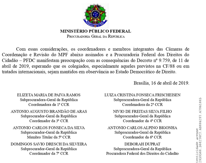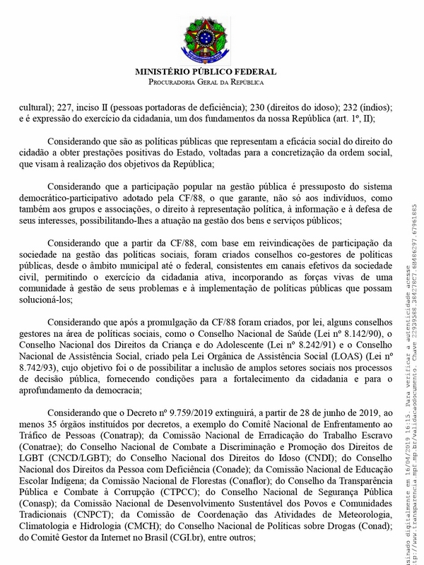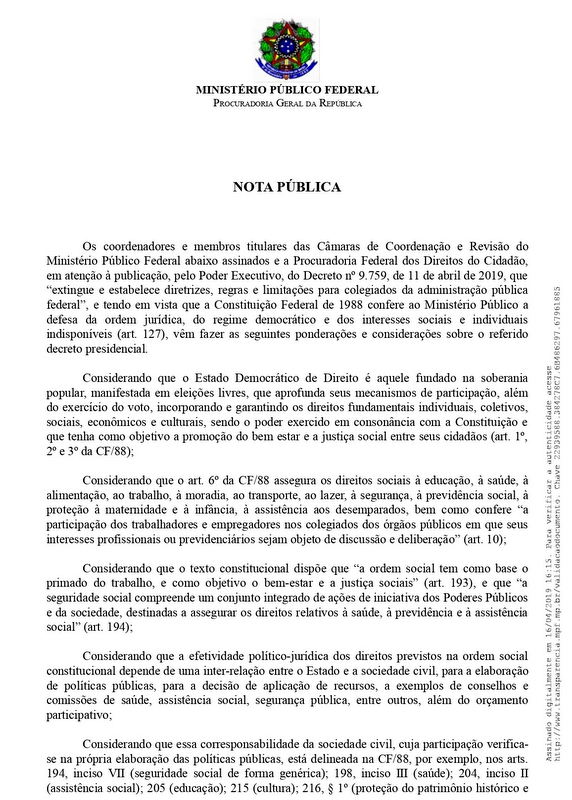 Todas as sete Câmaras de Coordenação e Revisão do Ministério Público Federal (MPF) e a Procuradoria Federal dos Direitos do Cidadão assinam nota pública manifestando a preocupação com a publicação do Decreto nº 9.759, do governo federal, que extingue e estabelece diretrizes, regras e limitações para colegiados da administração pública federal.